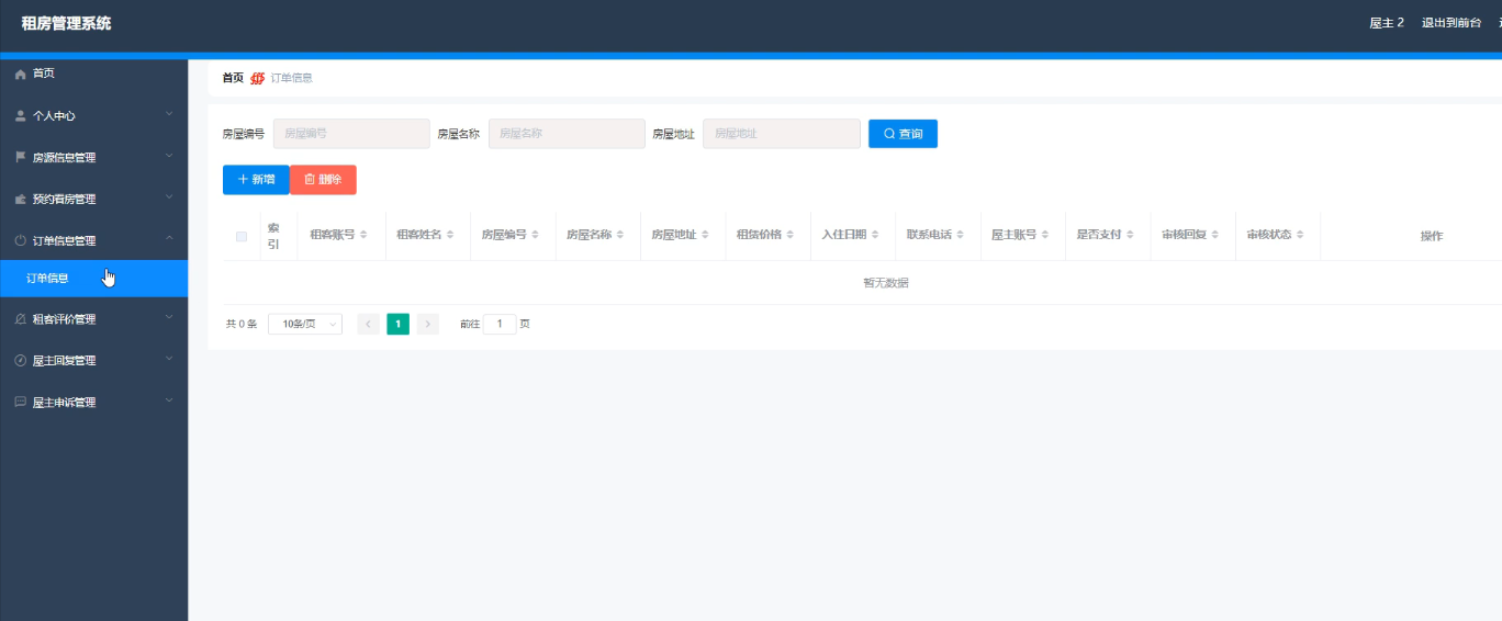屋主可以对订单信息进行添加修改删除操作,还可以对订单信息进行查询。界面如下图所示: