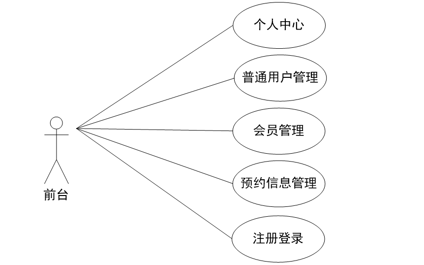 为了直观显示系统的功能,运用用例图这样的工具显示分析的结果。分析的前台功能如下。前台负责普通用户与会员的管理,审核会员预约信息。