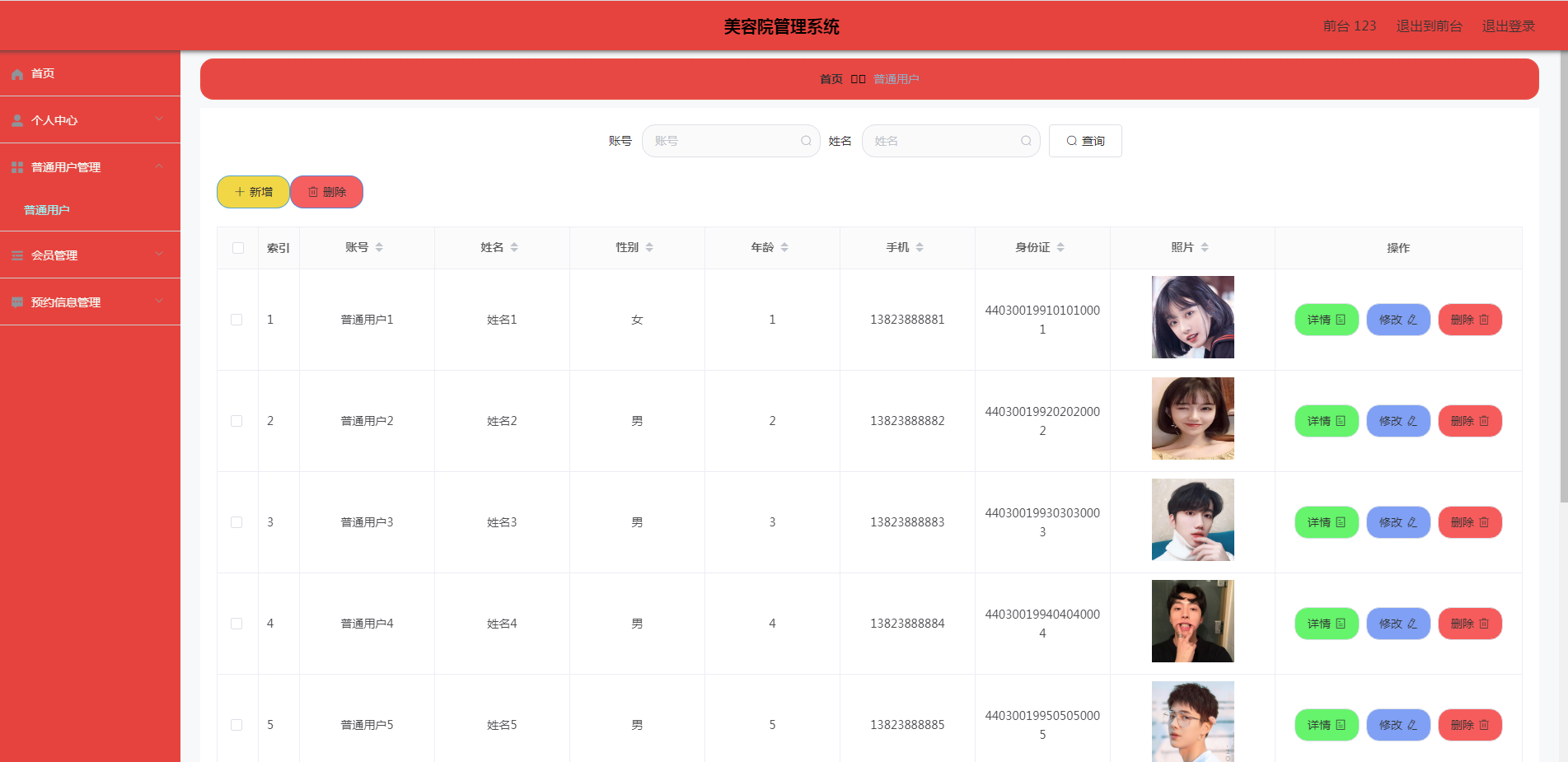 实现前台权限的普通用户管理功能,其运行效果见下图。普通用户的基本信息也能让前台进行增删改查管理。