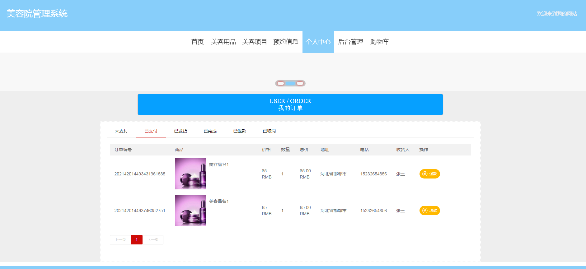 实现普通用户权限的我的订单功能,其运行效果见下图。普通用户在本模块查看不同状态的订单,已支付订单在未发货前也能退款。