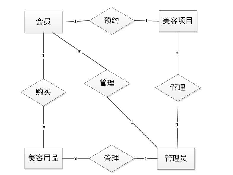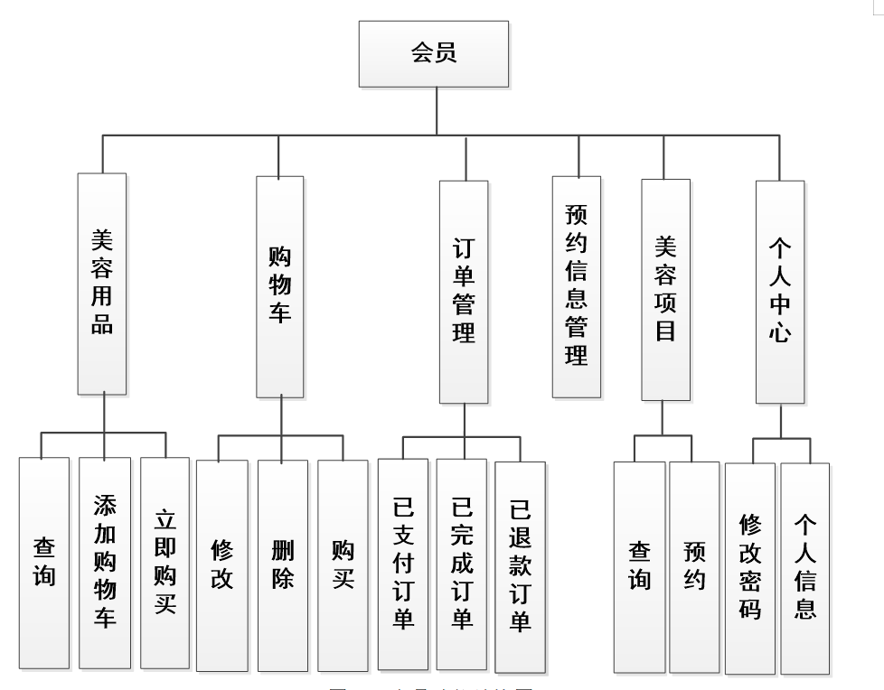 这部分内容使用结构图这样的工具,显示设计结果,设计的会员功能见下图。会员购买美容用品,预约美容项目,管理预约信息以及购买订单。