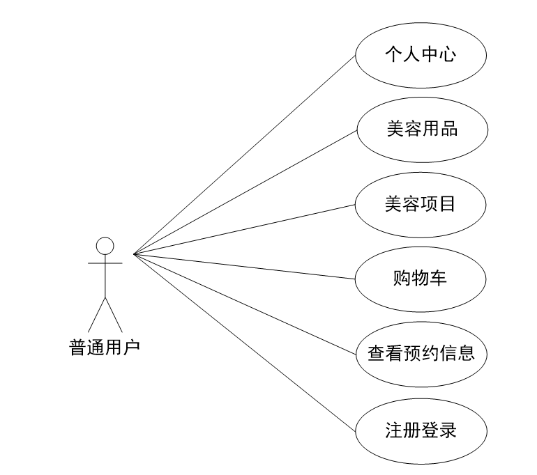 为了直观显示系统的功能,运用用例图这样的工具显示分析的结果。分析的普通用户功能如下。普通用户购买美容用品,管理购买订单,管理收货地址。