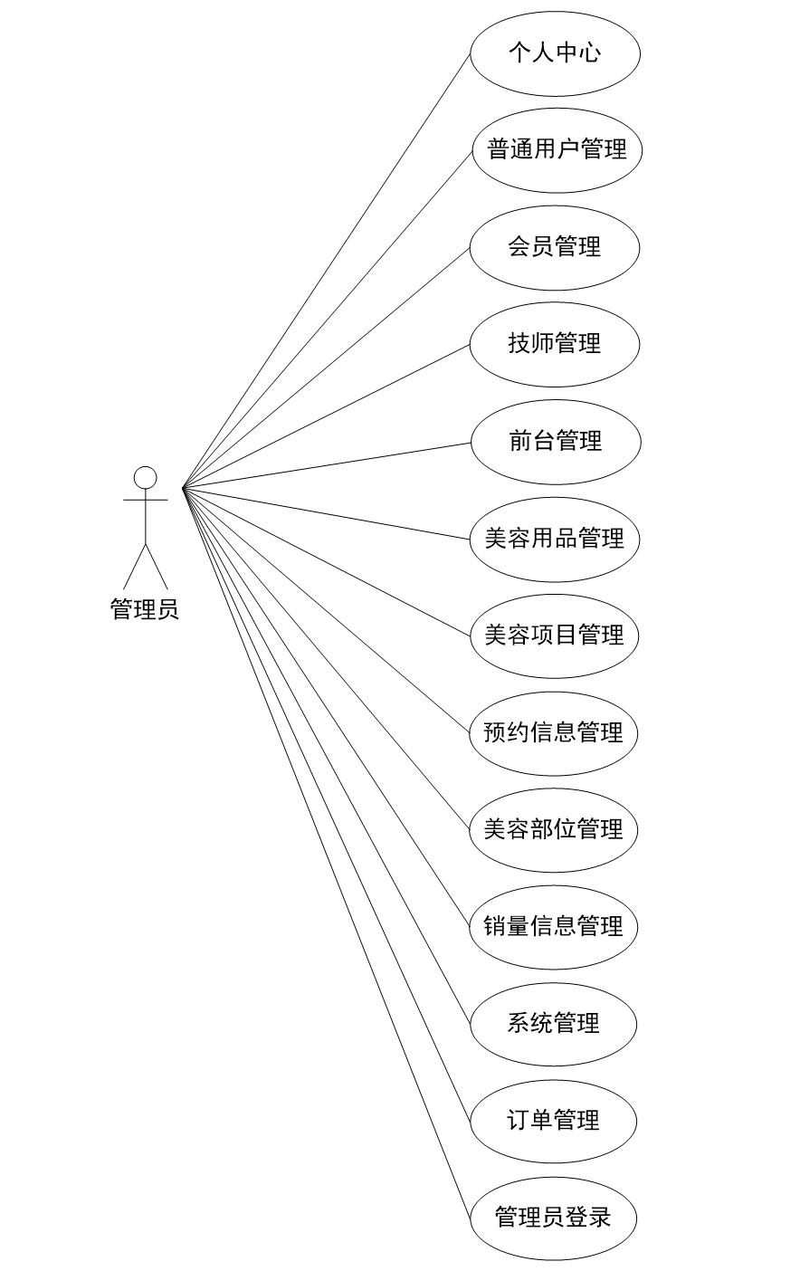 为了直观显示系统的功能,运用用例图这样的工具显示分析的结果。分析的管理员功能如下。管理员管理美容用品,美容项目,美容部位,管理技师预约,管理订单,统计美容用品销量。