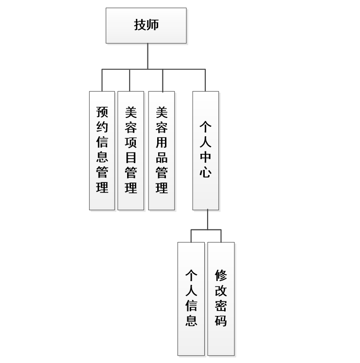 这部分内容使用结构图这样的工具,显示设计结果,设计的技师功能见下图。技师统计美容用品库存,管理美容项目,审核会员预约信息。