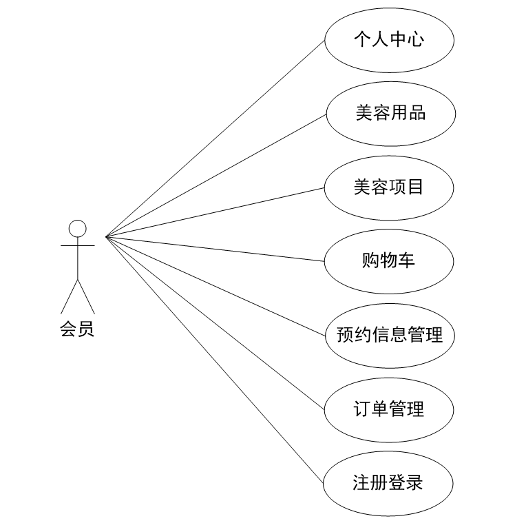 为了直观显示系统的功能,运用用例图这样的工具显示分析的结果。分析的会员功能如下。会员购买美容用品,预约美容项目,管理预约信息以及购买订单。