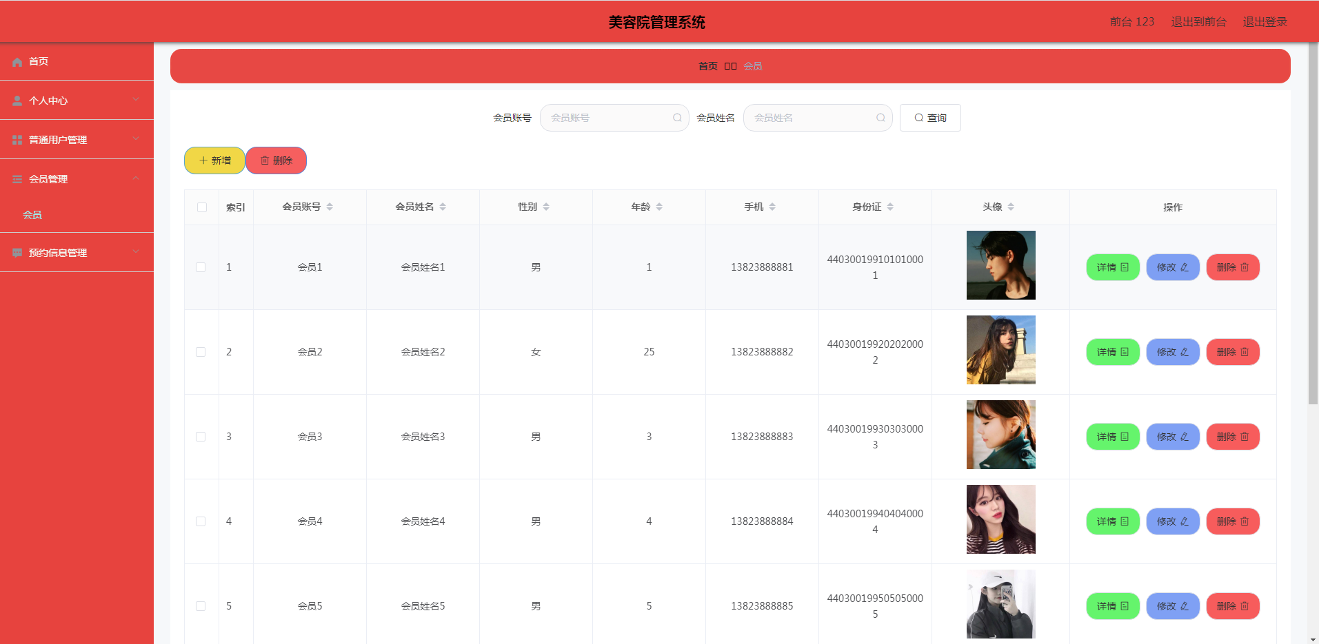 实现前台权限的会员管理功能,其运行效果见下图。会员的基本信息可以让前台进行修改,也能让前台进行查询或删除。