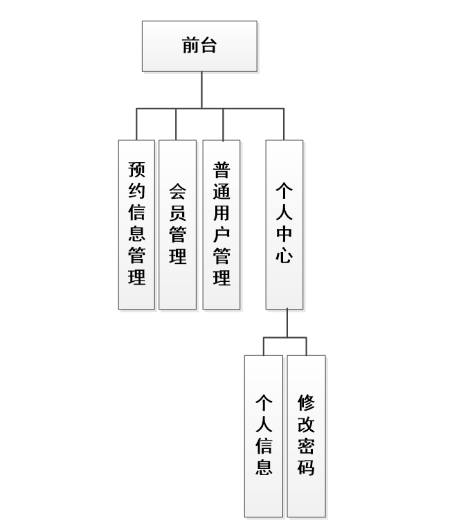 这部分内容使用结构图这样的工具,显示设计结果,设计的前台功能见下图。前台负责普通用户与会员的管理,审核会员预约信息。
