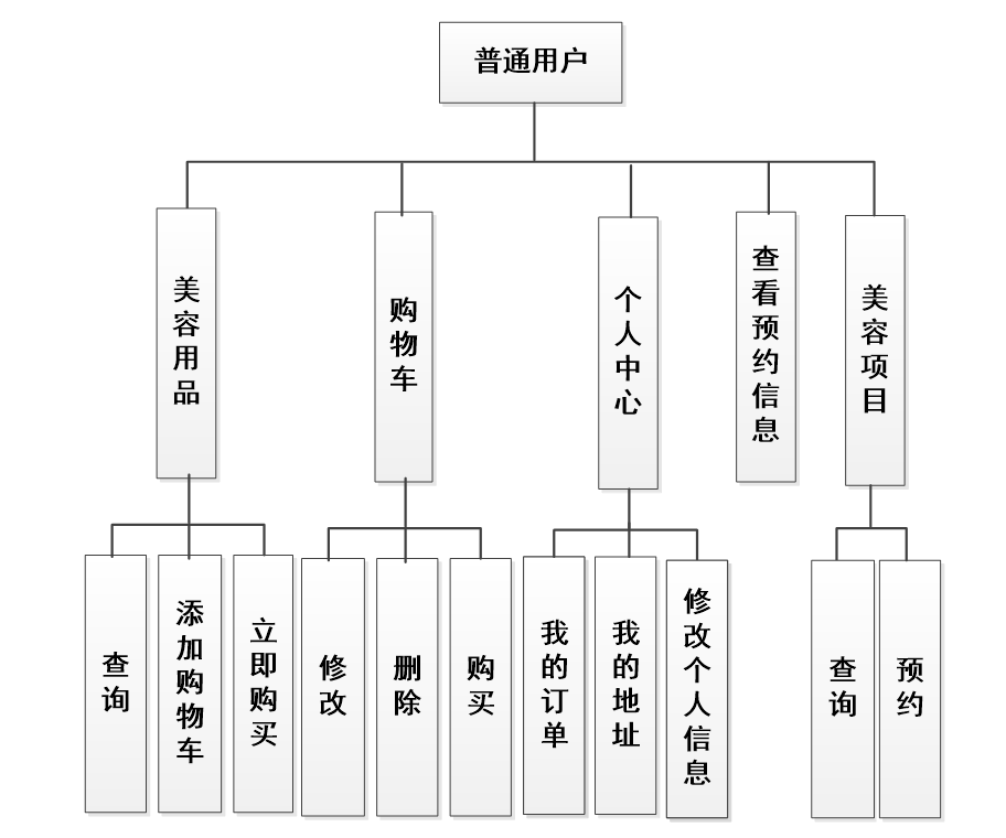 这部分内容使用结构图这样的工具,显示设计结果,设计的普通用户功能见下图。普通用户购买美容用品,管理购买订单,管理收货地址。