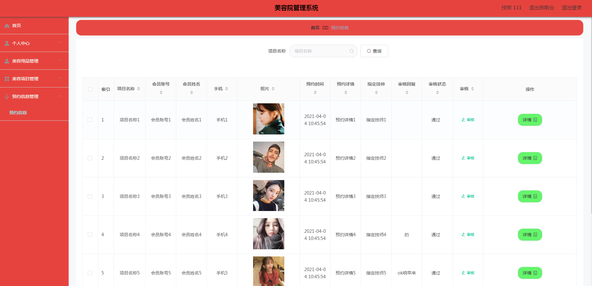 实现技师权限的预约信息管理功能,其运行效果见下图。会员预约技师提供的美容项目,技师则需要进行查看和审核。
