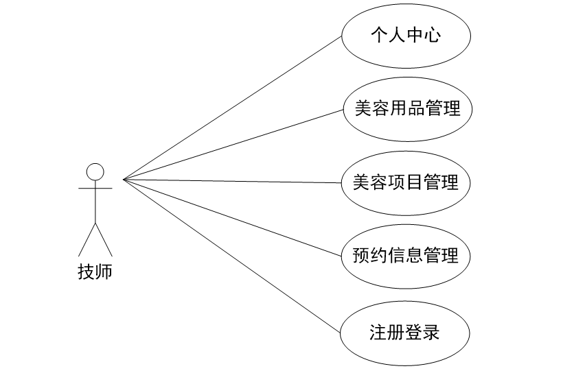 为了直观显示系统的功能,运用用例图这样的工具显示分析的结果。分析的技师功能如下。技师统计美容用品库存,管理美容项目,审核会员预约信息。