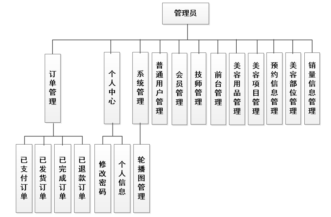 这部分内容使用结构图这样的工具,显示设计结果,设计的管理员功能见下图。管理员管理美容用品,美容项目,美容部位,管理技师预约,管理订单,统计美容用品销量。