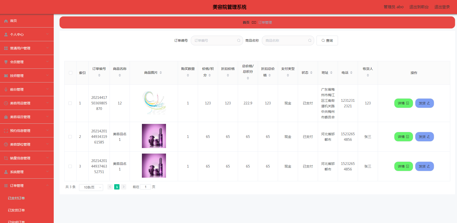 实现管理员权限的已支付订单功能,其运行效果见下图。管理员查看已支付订单信息,查看下单人提供的收货地址,然后进行订单发货。