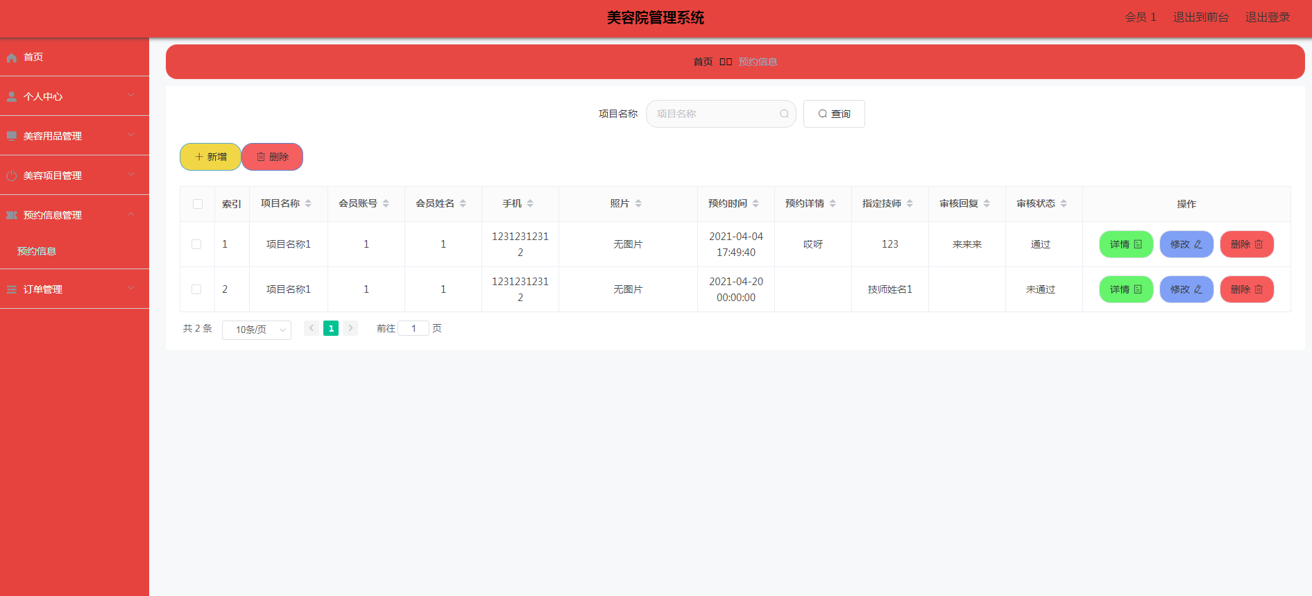 实现会员权限的预约信息管理功能,其运行效果见下图。会员提交了美容项目预约信息之后,需要到自己的后台查看预约项目审核情况。