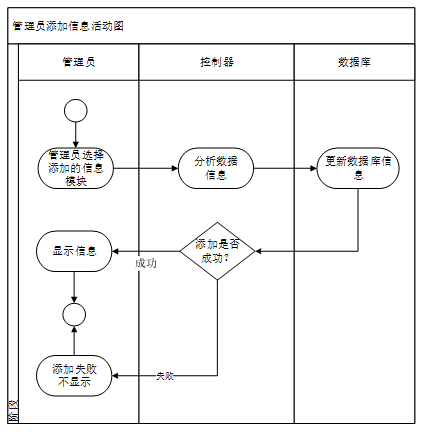 此活动图描述了管理员添加信息。管理员可以通过信息管理模块页面选择要添加的基本信息。添加成功传入数据库中,失败则不添加。管理员可以保存信息并更新系统中的信息。管理员添加信息功能的活动图如图3-4所示。