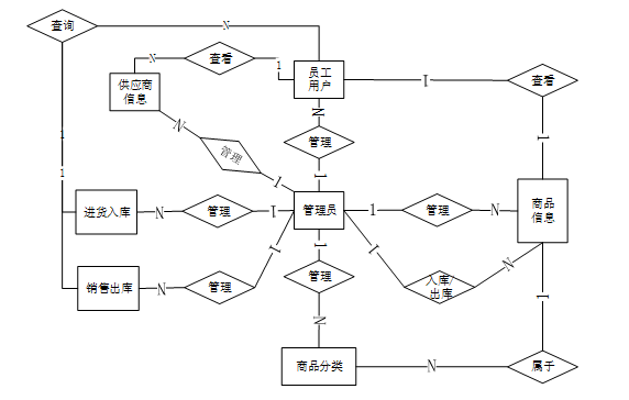 本文在系统分析阶段就抽取了一些实体,根据实体之间的关系,经过分析进行系统E-R图的设计。下面是整个小型超市管理系统中主要的数据库表总E-R实体关系图。
