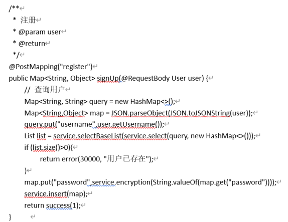注册页UserController.java,传入user对象,并将"user_id"、 "state"、 "user_group"、"login_time"、"phone"、"phone_state"、 "username"、"nickname"、"password"、"email"、"email_state"、"avatar"、"create_time"输入,重点是 "username"、"nickname"、"password"必须输入,通过获取username,数据库查询是否有该用户,如果存在,则提示“用户已存在”,否则执行将UserId置为空(数据库表中该字段已设置自动递增),代码如图所示。