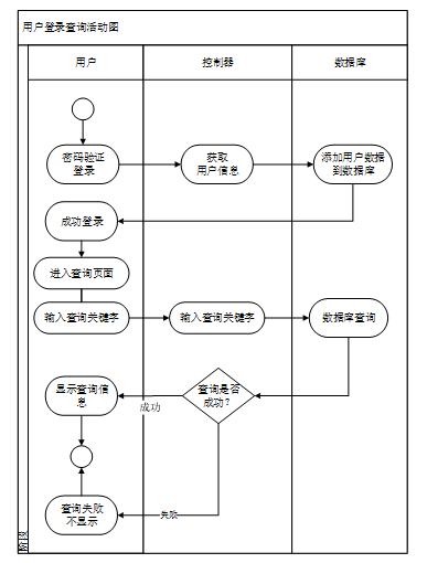 用户注册登录,系统从数据库获取用户数据信息,登录成功用户进入查询页面,用户输入查询关键字,数据库查询用户所输入的关键字,查询成功显示查询的模块信息,查询失败不显示。用户登录查询功能的活动图如图3-3所示。