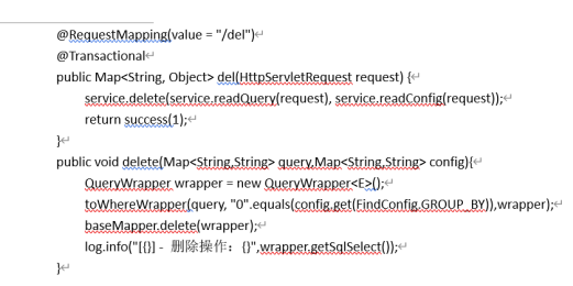 删除一条数据,通过readQuery(),获取URL后面的对象地址,删除FROM具体的table,query删除查询FindConfig语句,代码如图示。