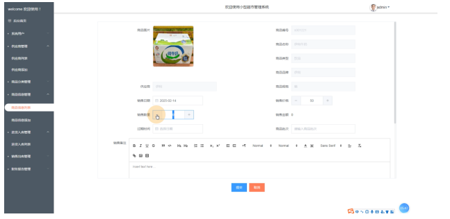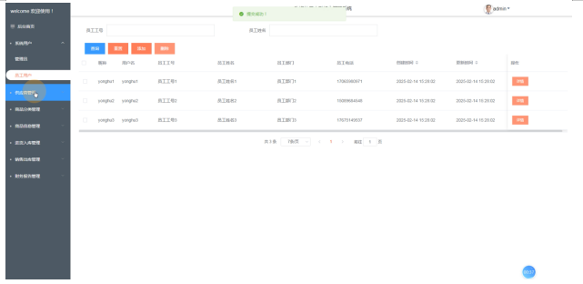 The system implementation mainly covers three core functional modules: first, the background home page for employee users displays sales outbound statistics, supplier inquiry, commodity information inquiry, and purchase warehousing and sales outbound record inquiry; The second is to design a more comprehensive management interface for administrators, including advanced functions such as financial report statistics, system user management, and commodity classification management. The Spring Boot framework is used to simplify the development process, ensure the stability and scalability of the system, and use the MySQL database to store data to ensure the efficiency of data processing.