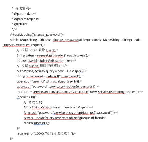 修改密码,通过请求data,获取旧密码,并将新密码重新赋值,期间都是需要通过加密,代码如图所示。