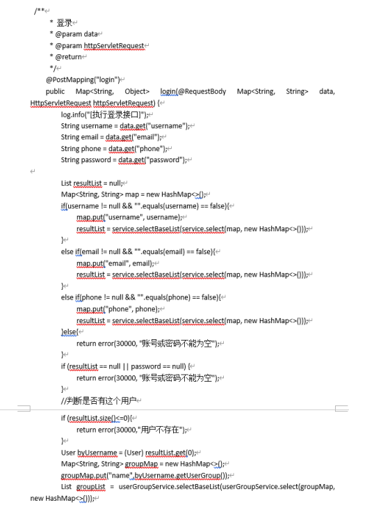 登录页,首先传入"username"、"email"、"phone"、"password",用户可通过用户名、邮箱、手机号进行登陆,通过判断resultList来确定查询结果,然后执行查询用户组UserGroup,用户组里面不存在,依然报“用户不存在”,执行完以上代码,最后涉及到用户带有“审核”的,会查询examine_state(用户的审核状态),数据库表user_group中含有source_table和source_field进行查询,以上步骤完成,对输入的密码进行存储Token到数据库,匹对账号和密码,数据库中的AccessToken为令牌,用于身份认证,代码如图所示。