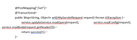 修改一个数据,原理与add基本一致,不同点在于通过readConfig()读取关键字,以及通过readQuery()获取URL后面?指定位置的标识,转成Map对象后,执行update操作,同样通过拼接的sql语句执行,执行过程读取query,toWhereSql()语句完成数据库操作,body为修改对象的值,代码如图所示。
