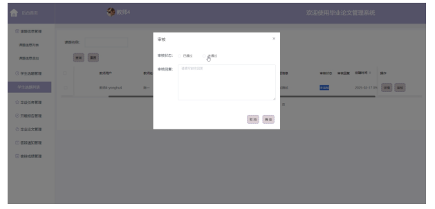 学生选题管理模块允许指导教师审核学生提交的选题申请,查看学生的选题意向与个人背景是否匹配课题需求。在此模块中,教师能够对每个申请做出批准或拒绝的决定,并附上具体的反馈意见。此功能有助于筛选出最适合的学生进行特定课题的研究工作,同时也保证了选题过程的专业性和规范性。学生选题审核界面如下图所示。