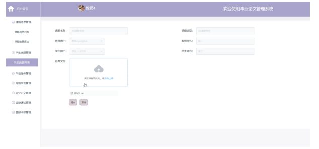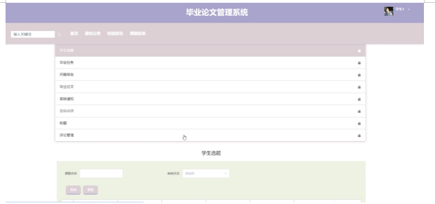 个人中心:集中管理个人首页、学生选题、毕设任务、开题报告、毕业论文、答辩通知、答辩成绩以及收藏和评论,便于学生跟踪个人选题进展。