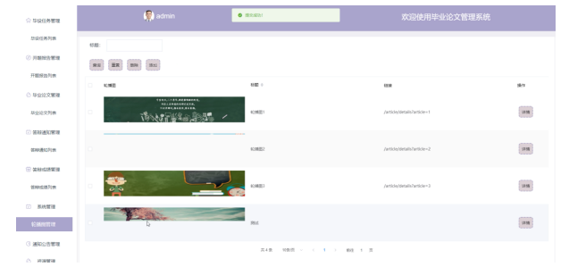 在系统管理下的轮播图管理模块中,管理员可以轻松上传、编辑和排序首页展示的轮播图内容,以吸引用户的注意力并传达重要信息。此模块支持添加图片标题和链接,使轮播图不仅作为视觉装饰,还能直接引导用户访问关键页面或最新活动详情。轮播图管理界面如下图所示。