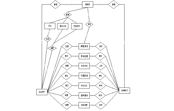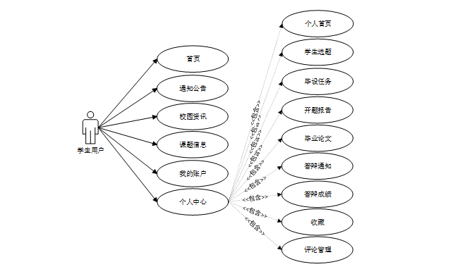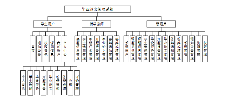 本研究的核心在于开发一个全面支持高校毕业论文管理流程的系统,旨在提高教育管理效率和质量。该系统主要分为三大用户模块:学生用户、指导教师及管理员。对于学生用户而言,系统提供了包括首页浏览、通知公告查看、校园资讯获取、课题信息查询以及个人中心等功能。个人中心内又细分为选题、毕设任务提交、开题报告撰写、毕业论文上传、答辩通知接收及成绩查询等子功能,确保学生能够在一个平台上完成所有必要的操作。指导教师则可以通过系统进行课题信息发布、学生选题审核、毕设任务分配、开题报告与毕业论文审核及答辩安排等工作。管理员角色则负责系统的全面管理,涵盖用户管理、权限设置、资源维护、数据监控等多个方面,以保证系统的正常运行。