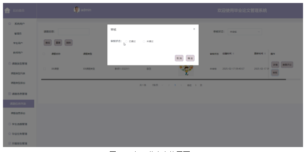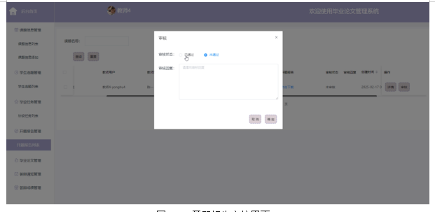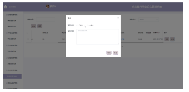 毕业论文管理模块旨在协助指导教师监督并指导学生完成毕业论文的撰写。在这个模块中,教师可以接收学生的论文草稿,对其进行审查,并提出针对性的修改意见。此外,教师还能通过此模块安排后续的答辩事宜,保障毕业论文工作的顺利完成。毕业论文审核界面如下图所示。