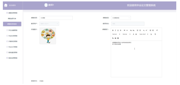课题信息管理模块为指导教师提供了一个便捷的平台,用于发布、编辑和删除自己负责的课题信息。通过该模块,教师可以详细描述课题的研究方向、目标及要求,并设置课题的状态。课题信息添加界面如下图所示。