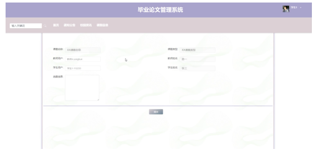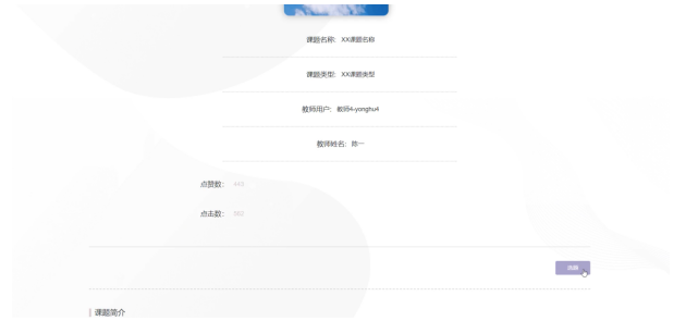 课题信息模块是学生选题过程中的核心部分,展示了由指导教师发布的各种课题详情,包括课题名称、类型、简介等。学生可以依据自身兴趣和专业方向搜索合适的课题,并直接在线提交选题申请。对于每个课题,系统还提供了点赞、收藏功能,方便学生记录感兴趣的项目。这一设计有效简化了选题流程,提高了匹配效率。课题信息展示界面如下图所示。