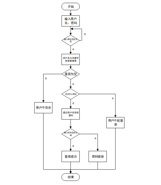 用户输入用户名和密码后,系统先检查输入是否为空,再验证用户名是否存在,若存在则通过用户名获取密码并校验。若密码正确则登录成功,否则提示密码错误。若用户名不存在或无法登录,提示用户操作无效。如图4-2所示。