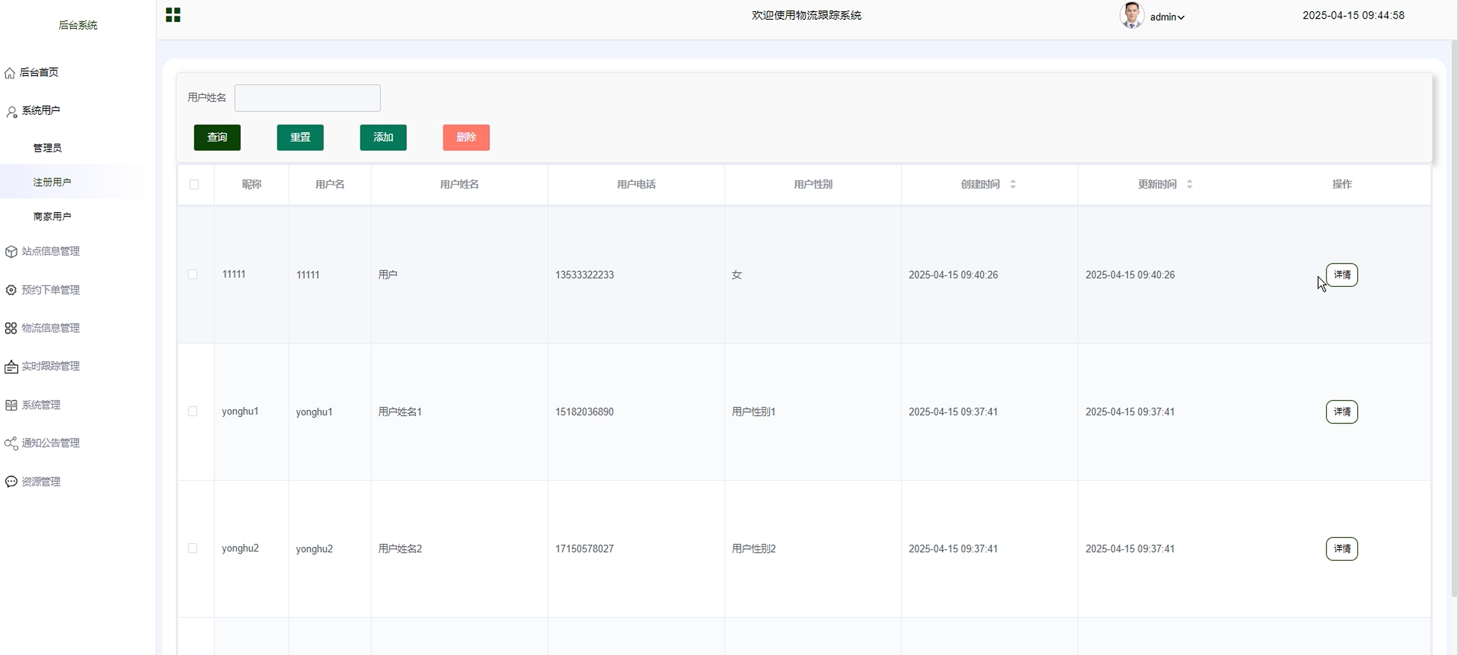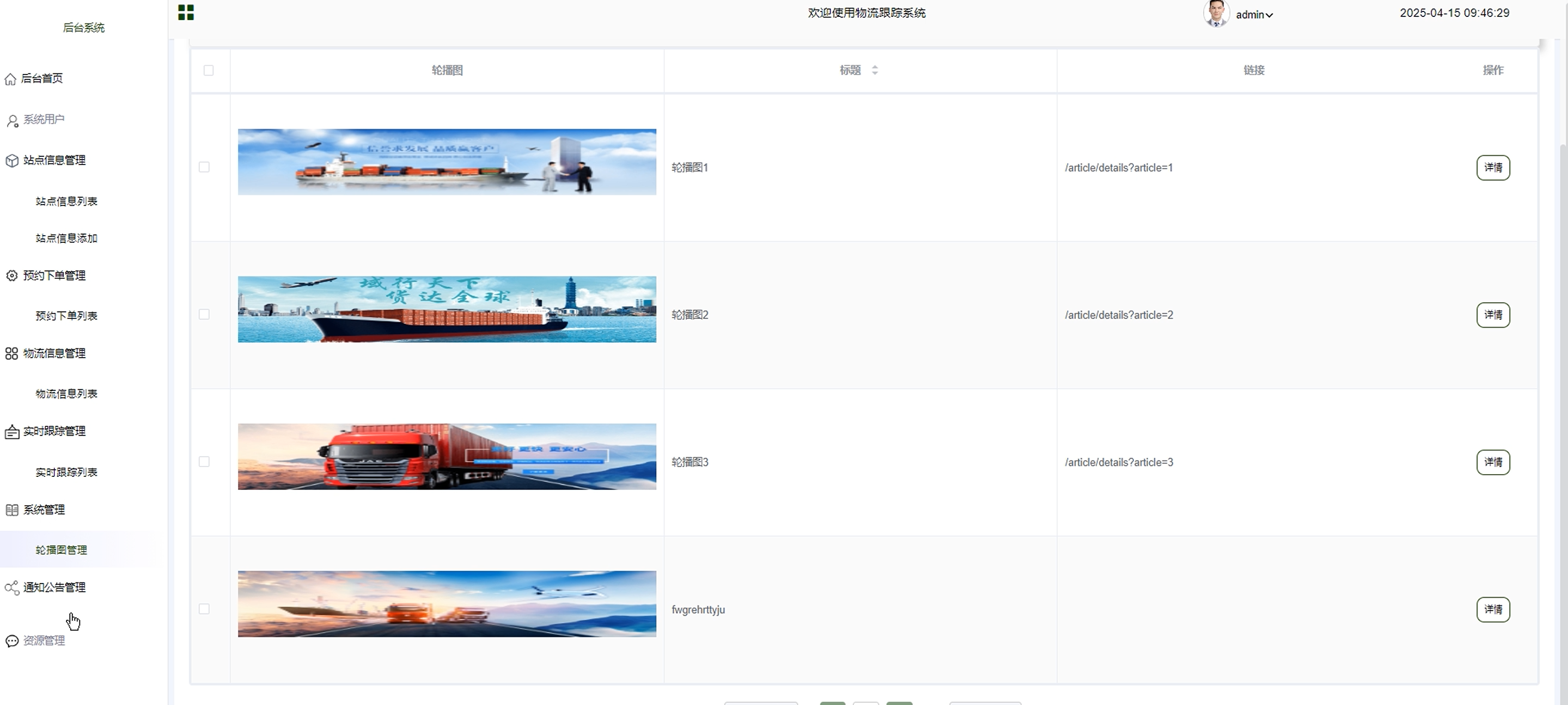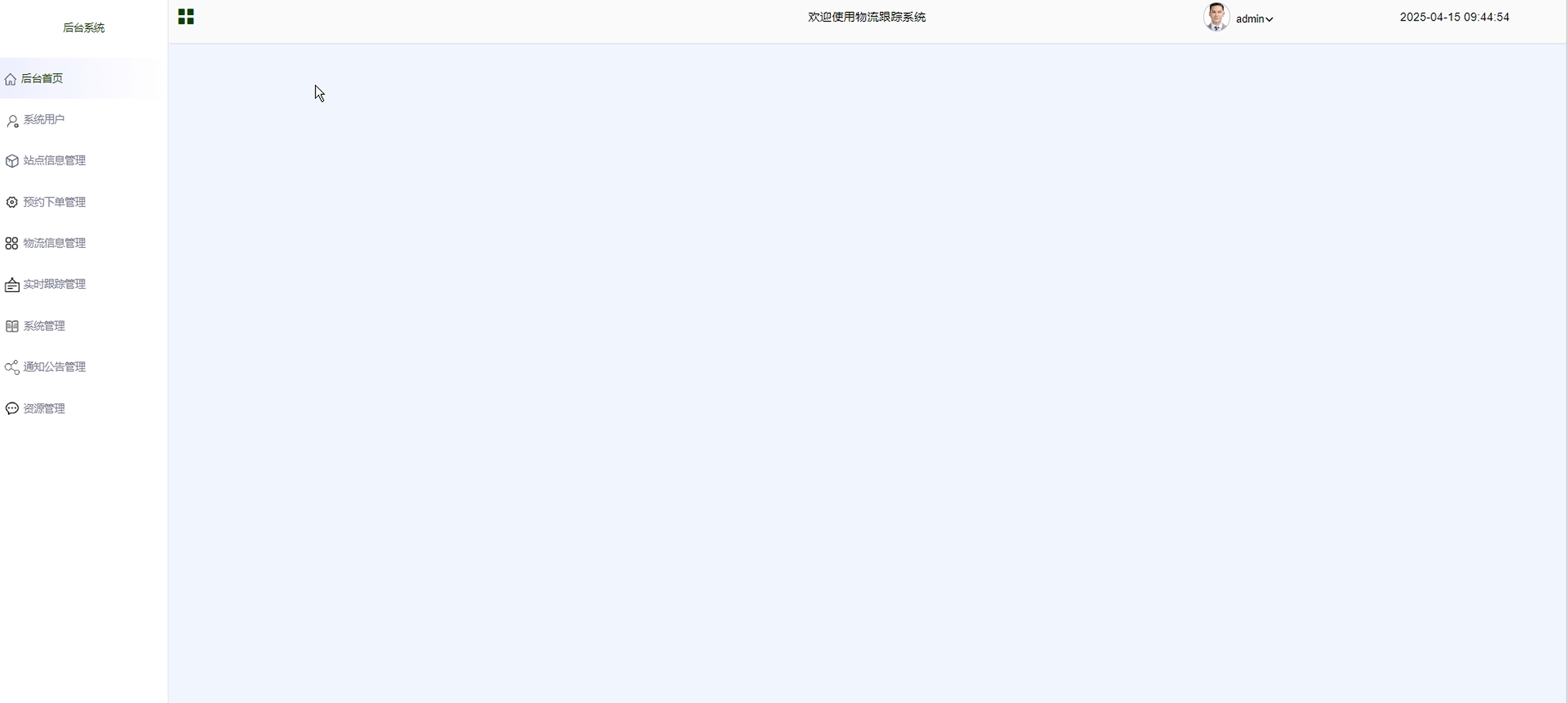 管理员:后台首页、系统用户(用户、商家、管理员)、站点信息管理、预约下单管理、物流信息管理、实时跟踪管理、系统管理(轮播图)、通知公告管理、资源管理(物流资讯、资讯分类)等功能。