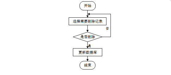 用户选择需要删除的记录后,系统判断是否确认删除。若未确认,返回选择环节;若确认删除,则更新数据库,删除对应记录,完成操作后流程结束。删除信息流程图如图4-5所示。
