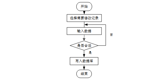 用户首先选择需要修改的记录,输入修改后的数据,系统判断输入数据是否合法。若数据不合法,提示重新输入;若数据合法,则将修改后的数据写入数据库,完成操作后流程结束。修改信息流程图如图4-4所示。