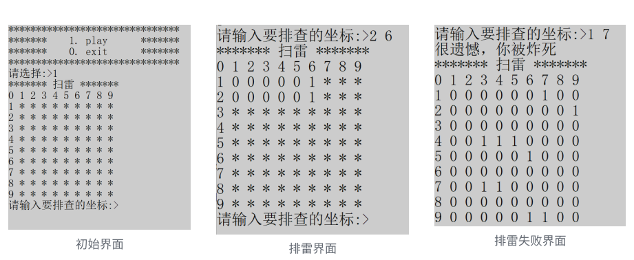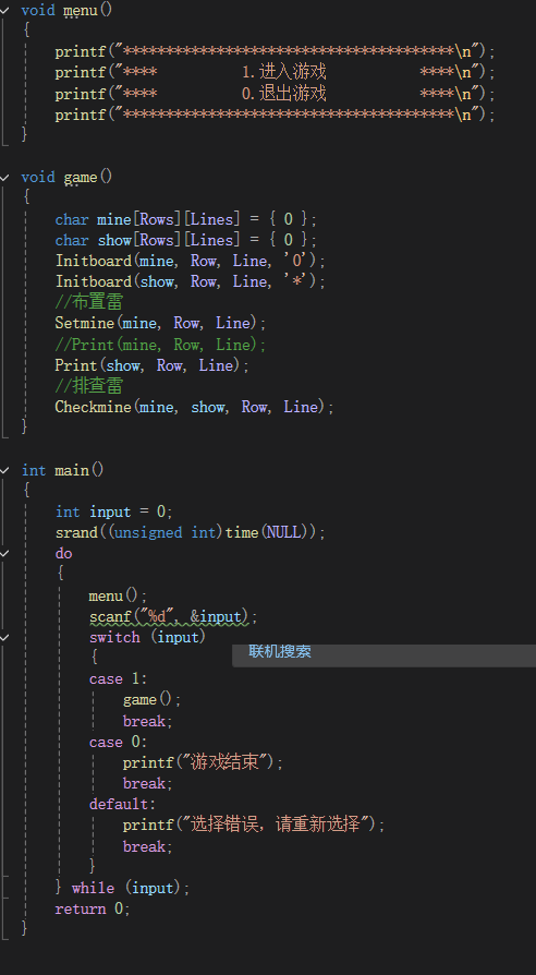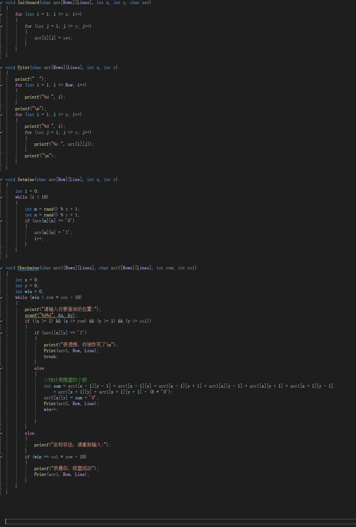 - 再继续分析,我们在棋盘上布置了雷,棋盘上雷的信息(1)和非雷的信息(0),假设我们排查了某 ⼀个位置后,这个坐标处不是雷,这个坐标的周围有1个雷,那我们需要将排查出的雷的数量信息记录存储,并打印出来,作为排雷的重要参考信息的。那这个雷的个数信息存放在哪里呢?如果存放在布 置雷的数组中,这样雷的信息和雷的个数信息就可能或产生混淆和打印上的困难。这里我们肯定有办法解决,比如:雷和非雷的信息不要使用数字,使用某些字符就行,这样就避免冲突了,但是这样做棋盘上有雷和非雷的信息,还有排查出的雷的个数信息,就比较混杂,不够方便。 这里我们采用另外⼀种方案,我们专门给⼀个棋盘(对应⼀个数组mine)存放布置好的雷的信息,再 给另外⼀个棋盘(对应另外⼀个数组show)存放排查出的雷的信息。这样就互不干扰了,把雷布置到 mine数组,在mine数组中排查雷,排查出的数据存放在show数组,并且打印show数组的信息给后期排查参考