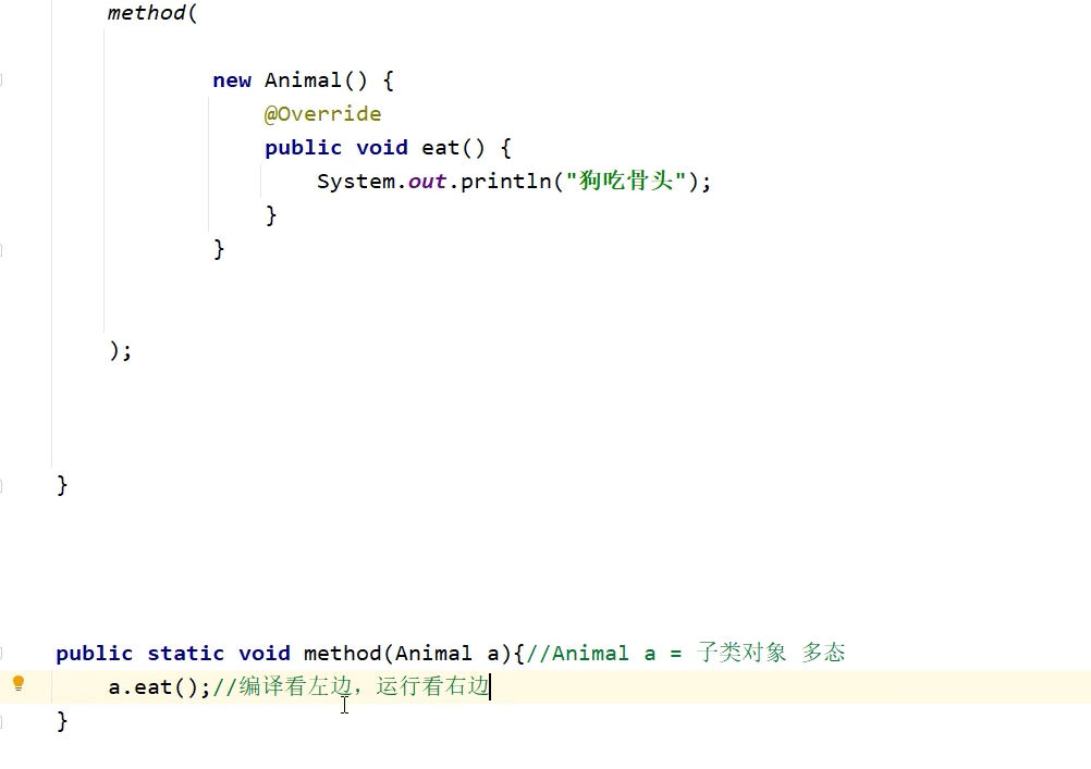 - 直接在method()中填入一个匿名内部类<继承于Animal>,同时重写了自己的eat()方法