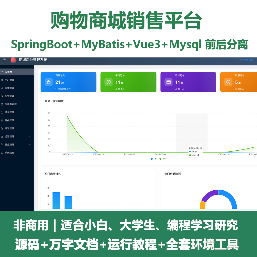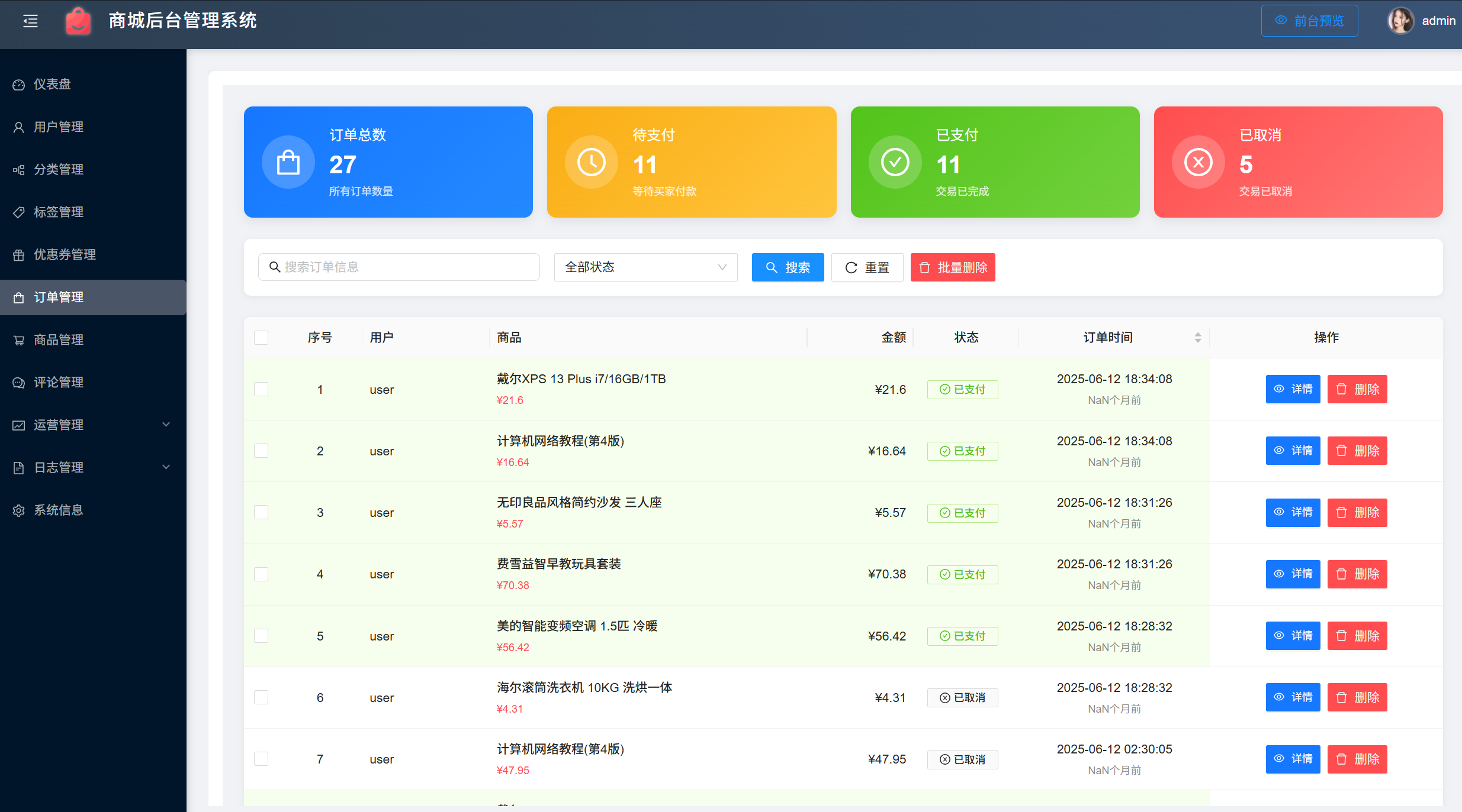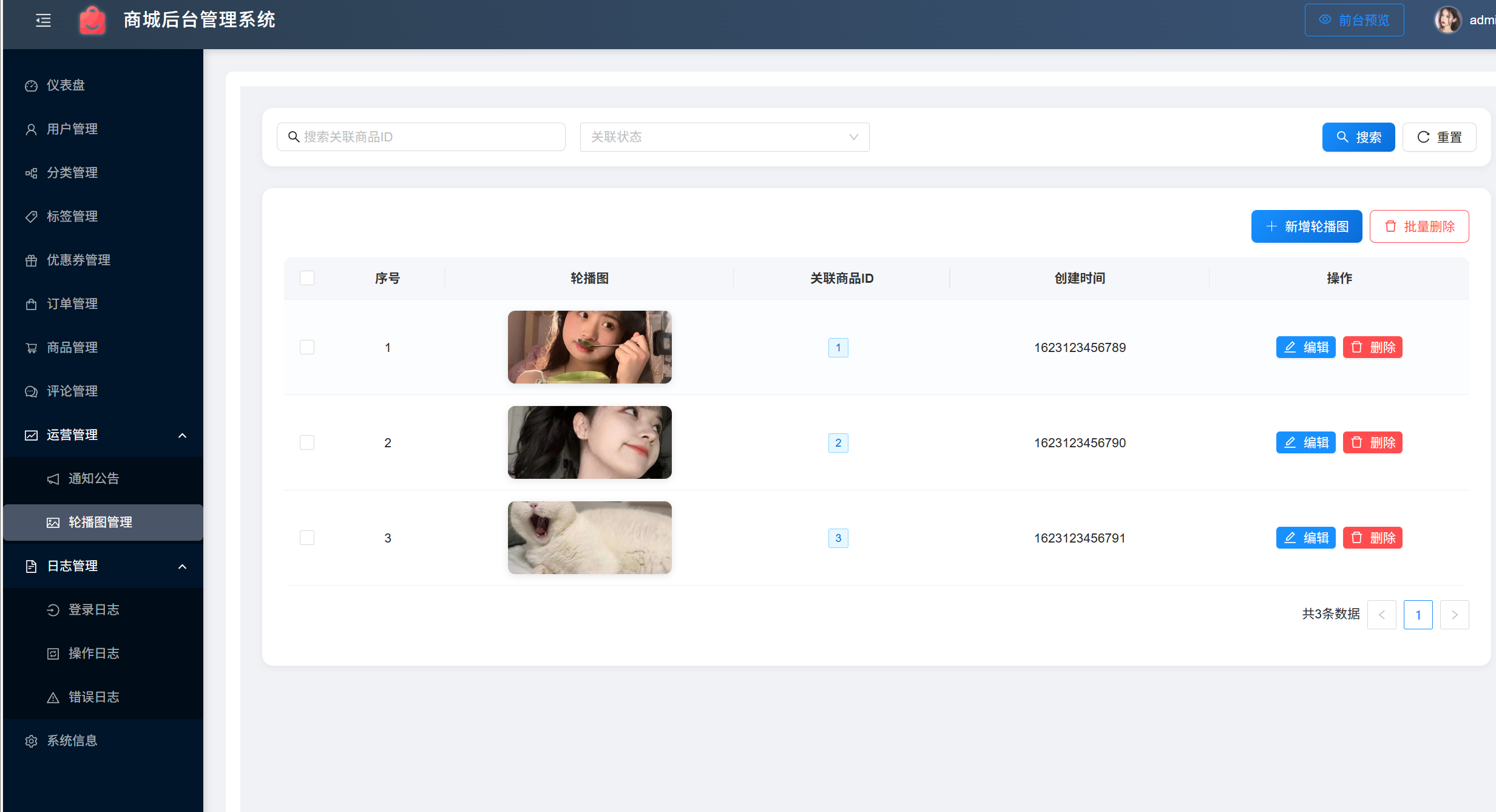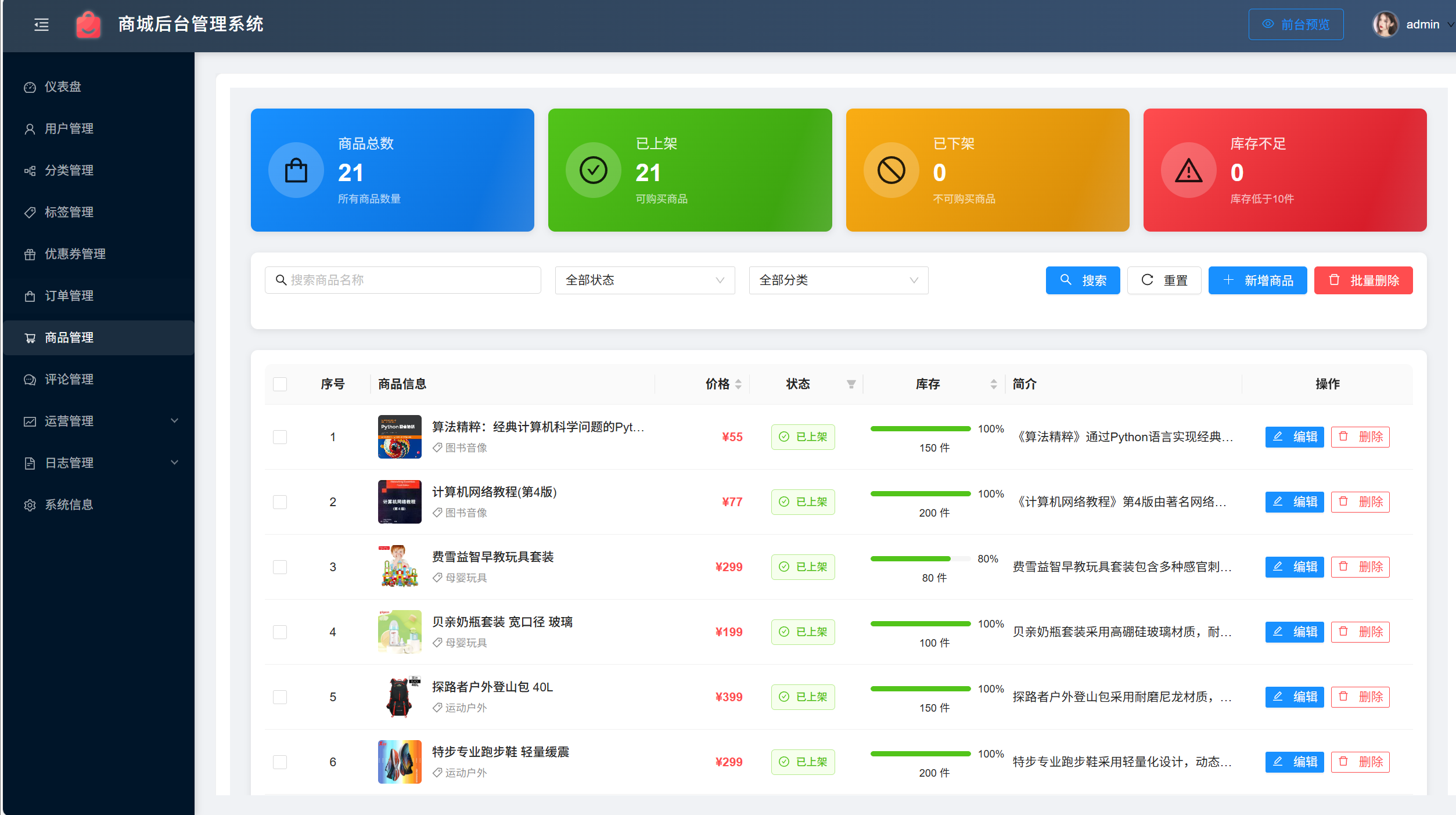 管理员端:用户管理,分类管理,标签管理,订单管理,商品管理,评论管理,通知公告,登录日志,操作日志,错误日志,系统信息,地址管理,积分管理,个人资料,消息管理,优惠券管理,轮播图管理