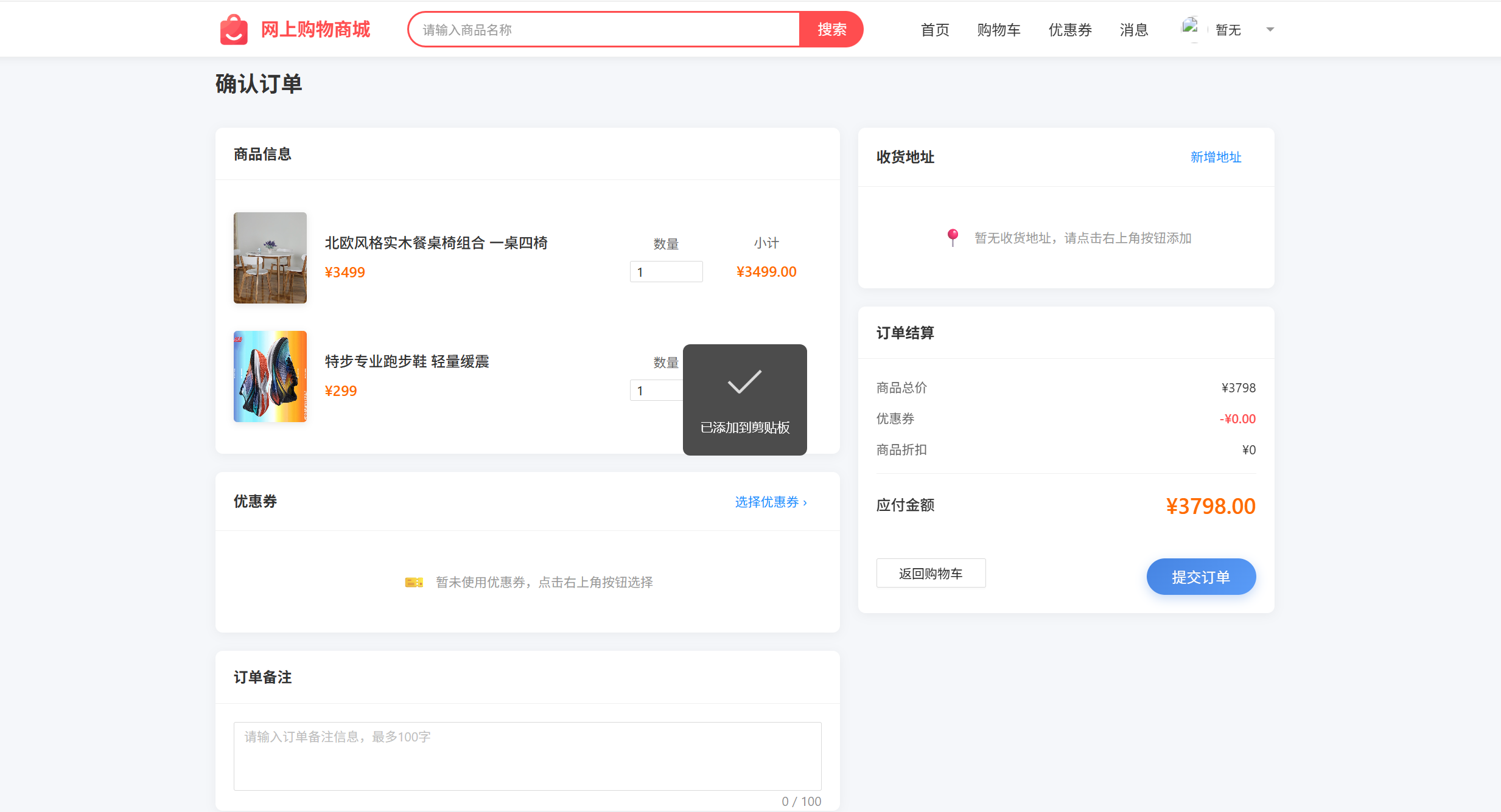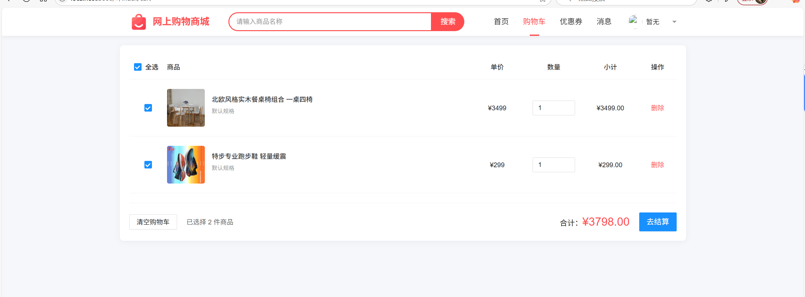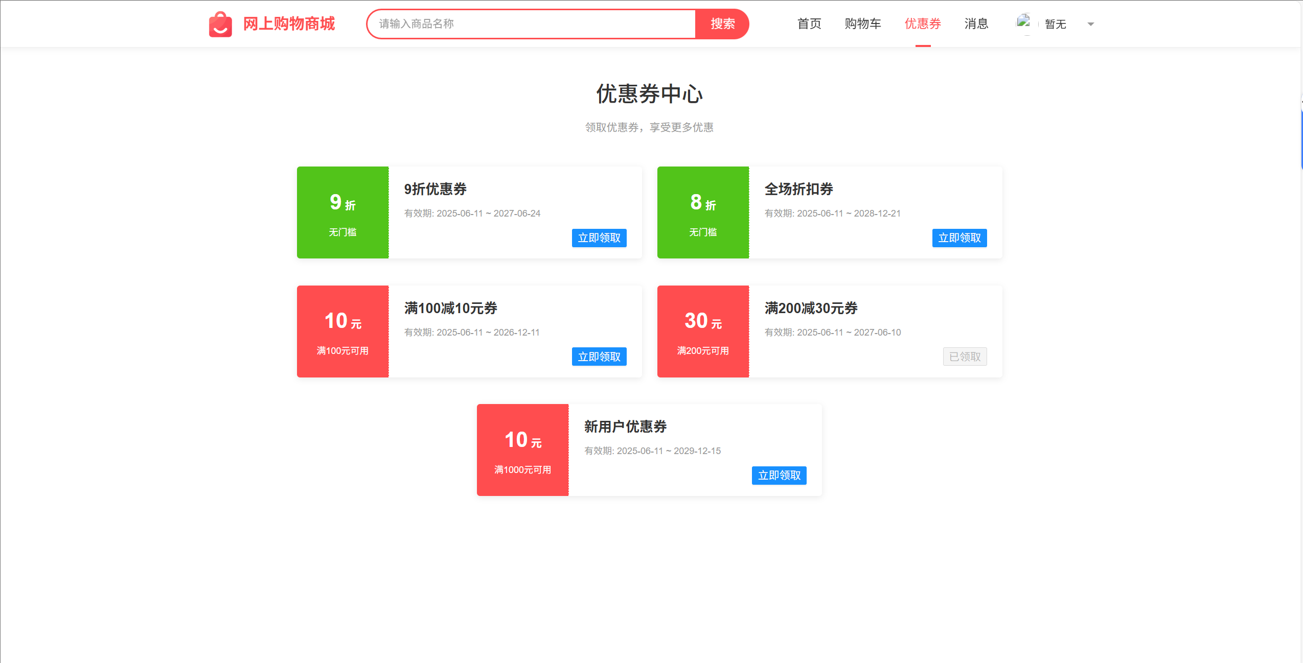 用户端:轮播图展示,商品分类查询,购物车添加,优惠券领取,商品下单(可使用优惠券),商品评论,收藏/分享/购物车,地址管理,个人资料,消息管理