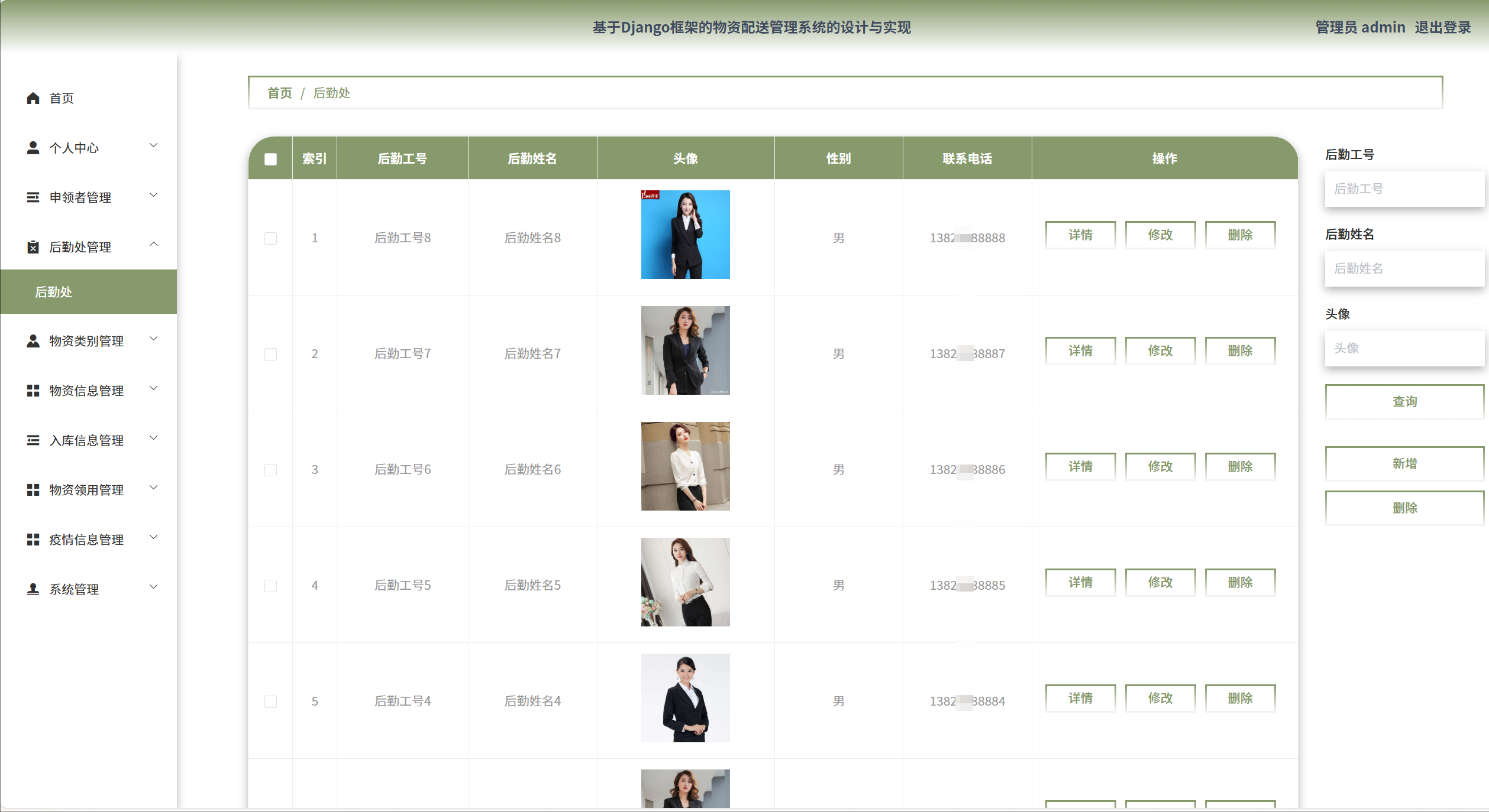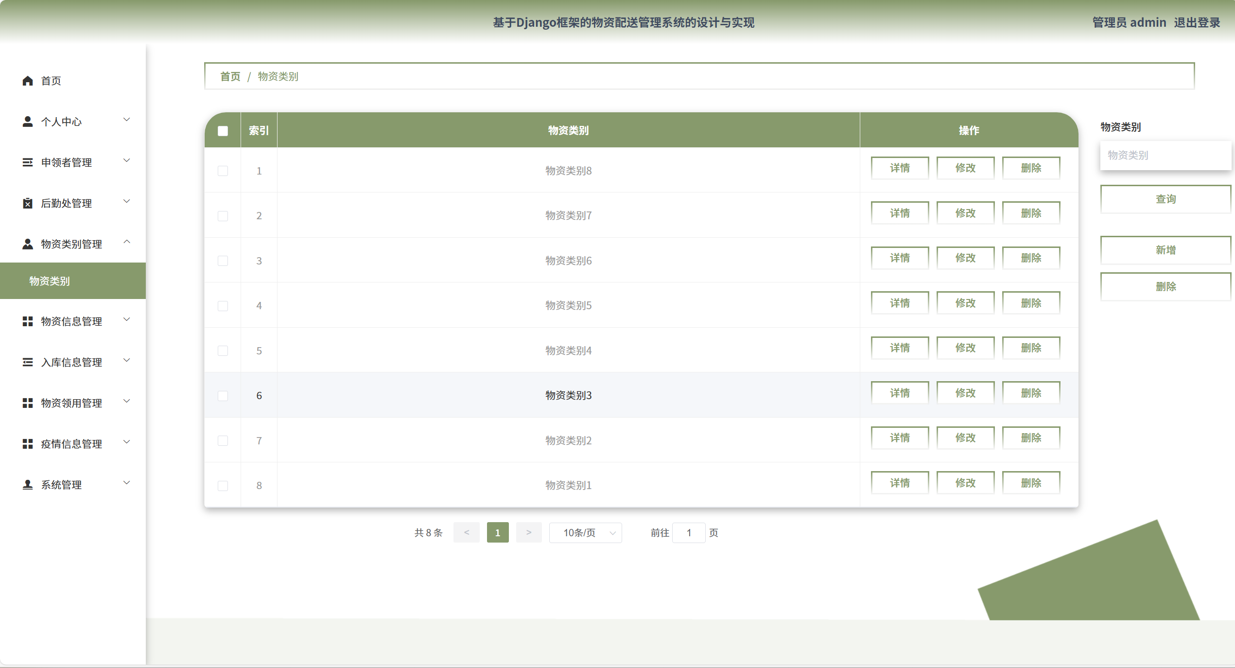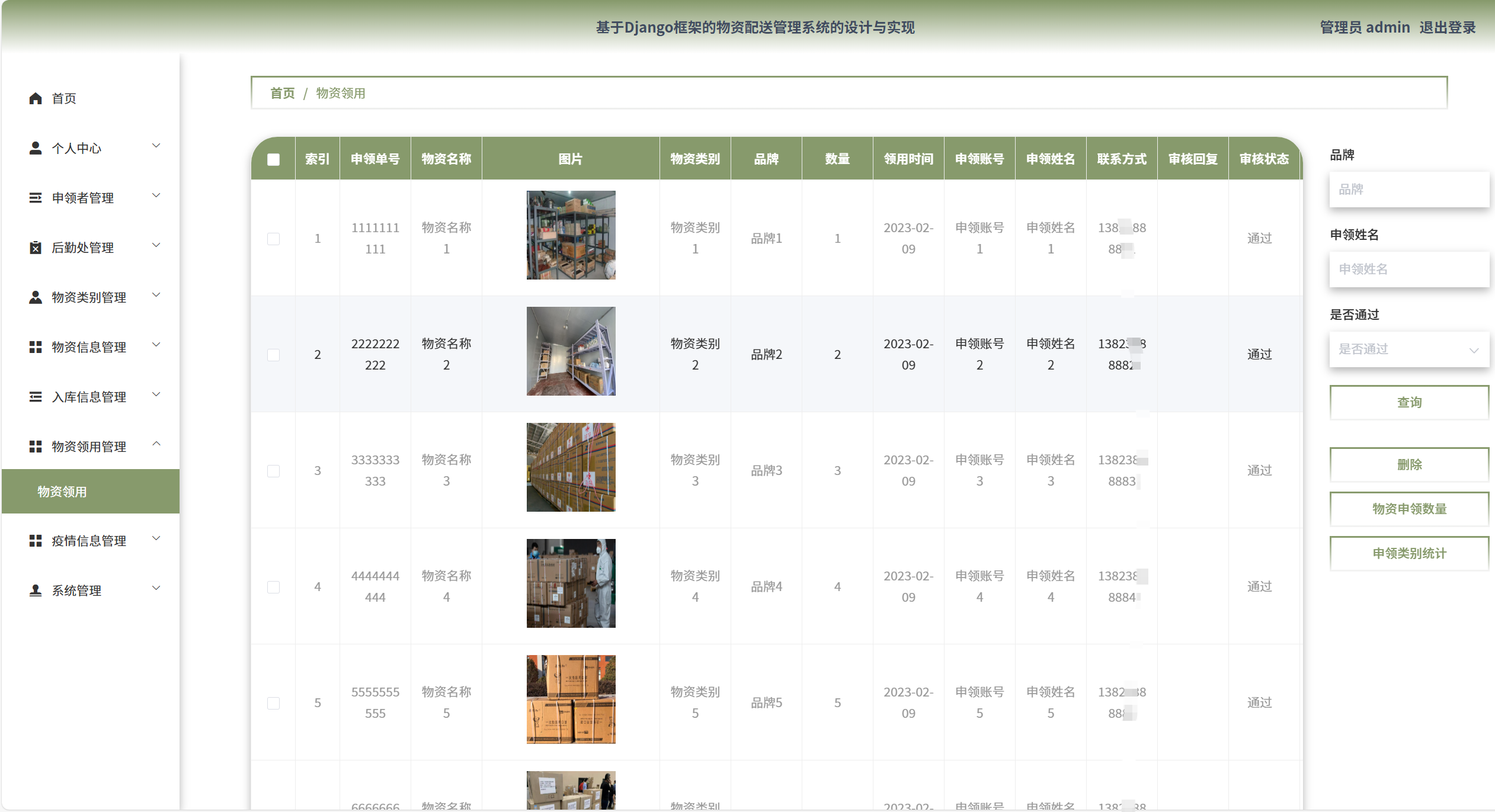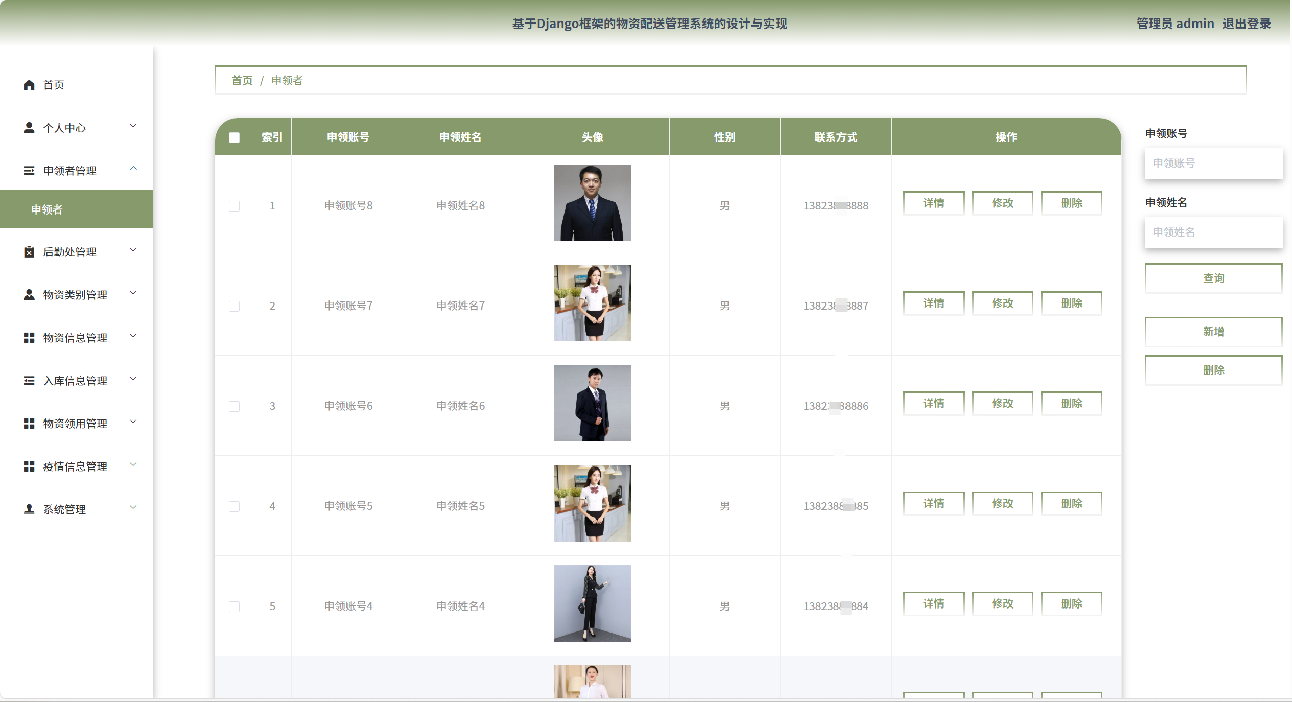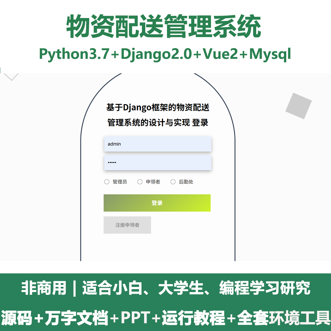 与其它应用程序相比,物资配送的设计主要面向于物资申领平台,旨在为管理员和申领者、后勤处提供一个物资配送管理系统。用户可以通过系统及时查看物资信息等。
