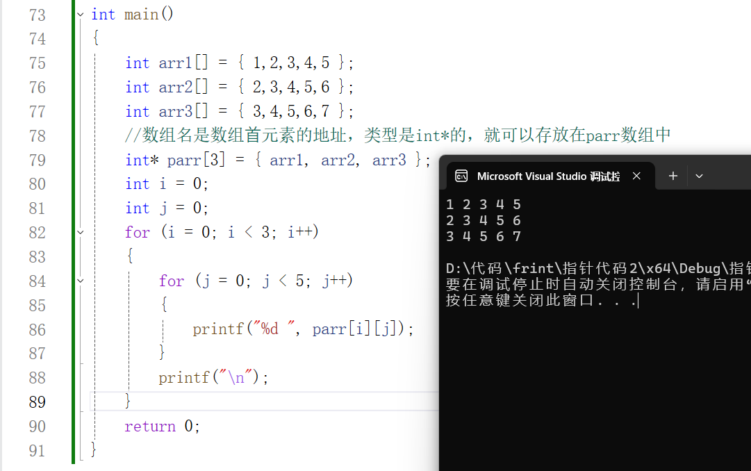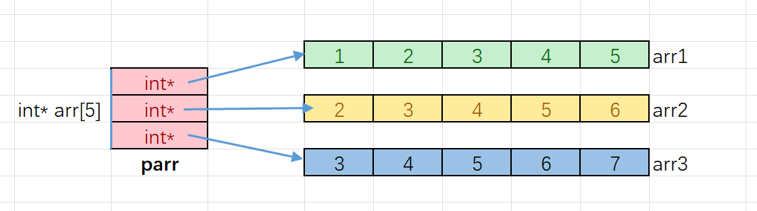 parr[i]是访问parr数组的元素,parr[i]找到的数组元素指向了整型⼀维数组,parr[i][j]就是整型⼀维数组中的元素。