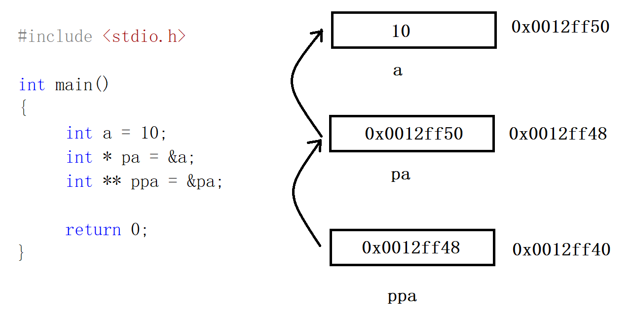 **ppa 先通过 *ppa 找到 pa ,然后对 pa 进⾏解引⽤操作: *pa ,那找到的是 a .
