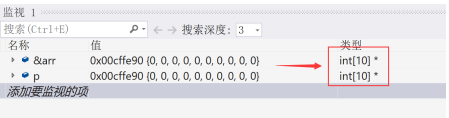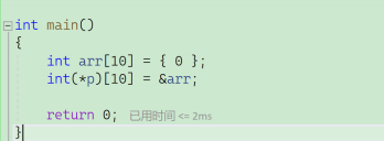 解释:p先和*结合,说明p是⼀个指针变量,然后指针指向的是⼀个⼤⼩为10个整型的数组。所以p是⼀个指针,指向⼀个数组,叫数组指针。