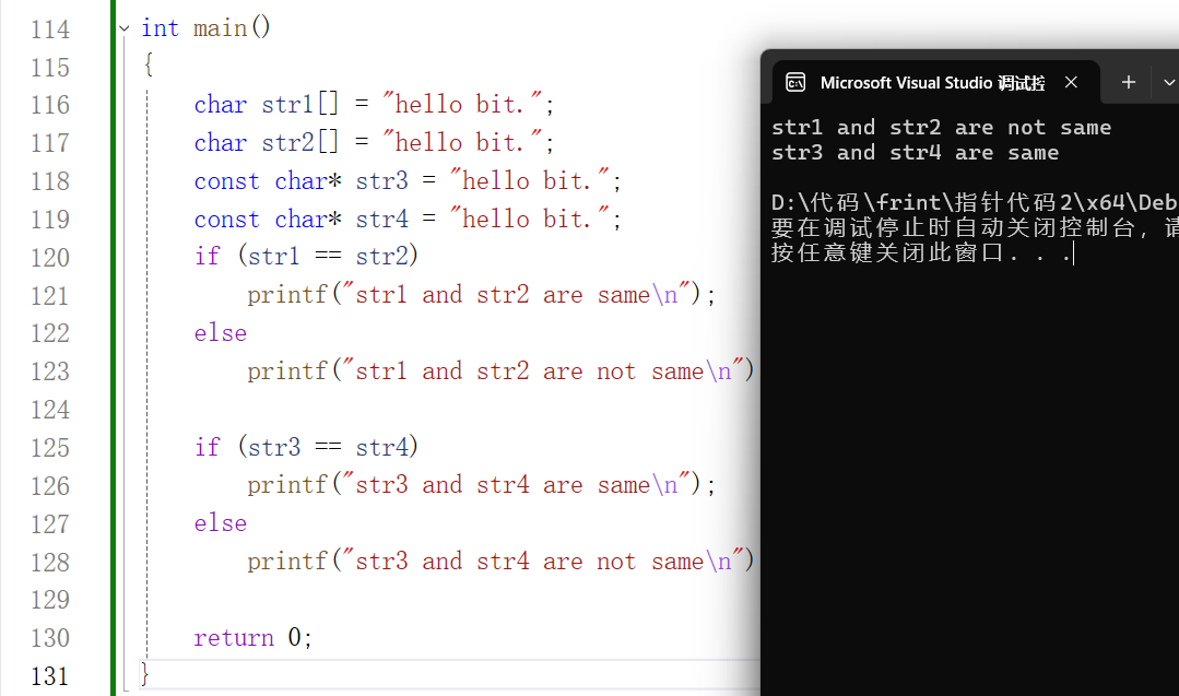 这⾥str3和str4指向的是⼀个同⼀个常量字符串。C/C++会把常量字符串存储到单独的⼀个内存区域,当⼏个指针指向同⼀个字符串的时候,他们实际会指向同⼀块内存。