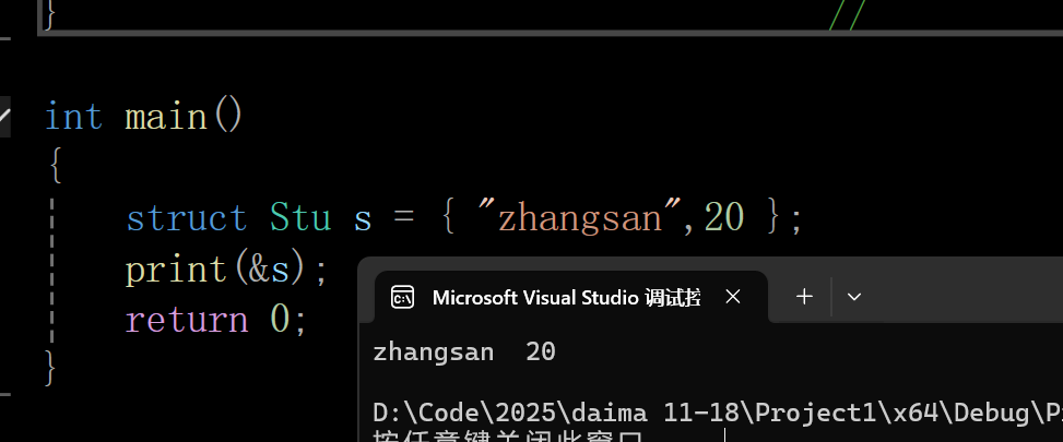 - printf("%s %d \n", ps->name, ps->age); //利用结构体成员访问符打印 ,这里的->是结构体成员的间接访问操作符