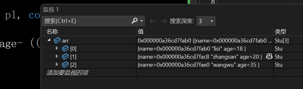 struct Stu arr[3] = { {"zhangsan",20},{"lisi",18} ,{"wangwu",35} };//结构体的初始化
