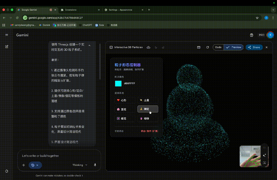 HTML/JS/React实时渲染环境:Canvas就像在浏览器里内置了一个轻量级的IDE。它不仅能显示代码,还能直接运行前端代码。对于WebGL(如Three.js)这种依赖浏览器环境的库,Canvas提供了原生的执行沙箱,这使得调用摄像头(WebcamAPI)变得非常顺滑,而不需要像以前那样把代码复制到本地服务器运行。