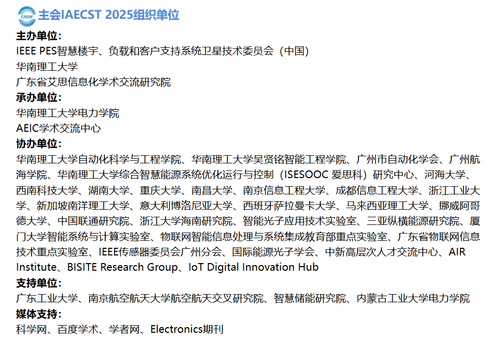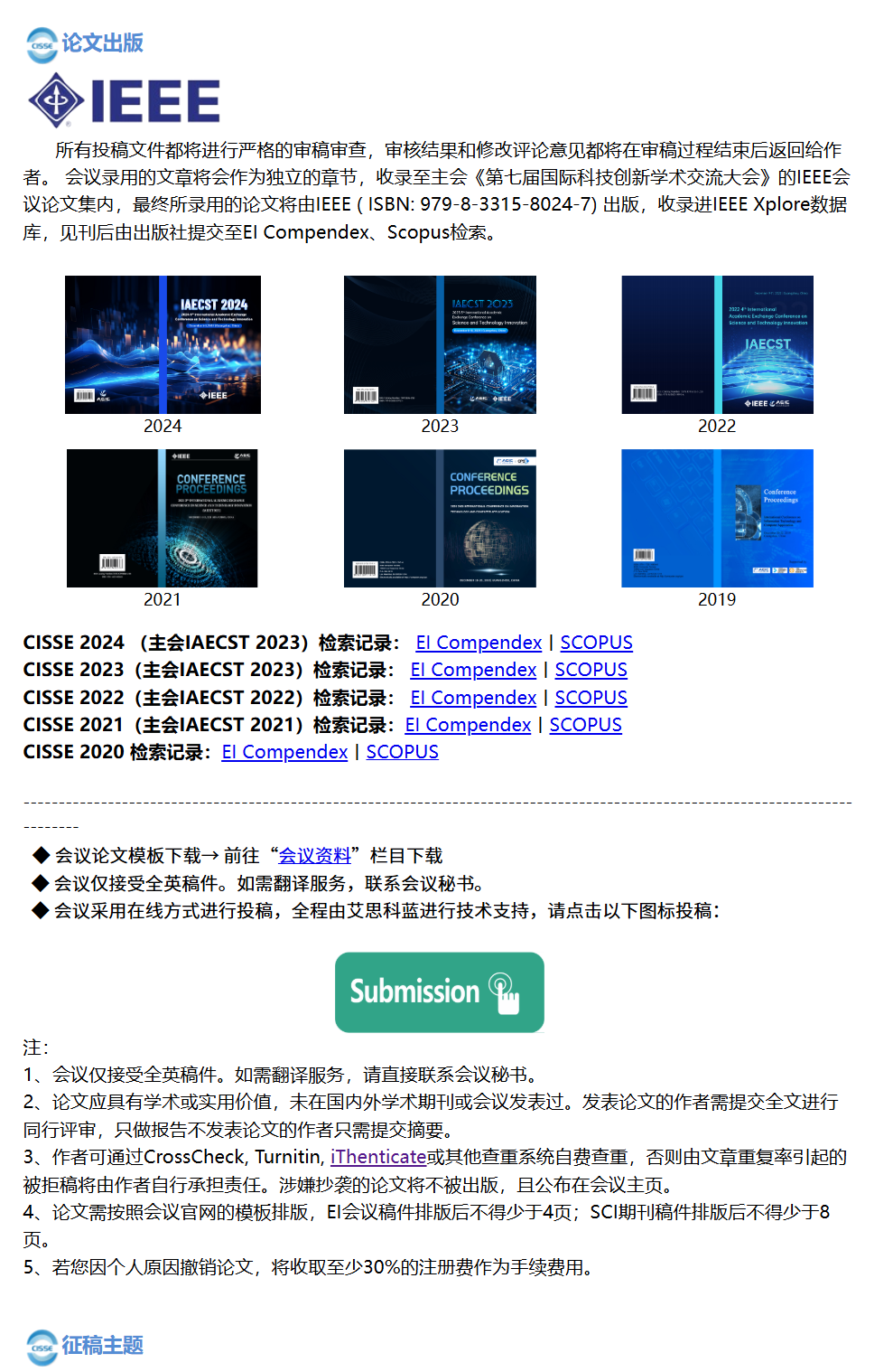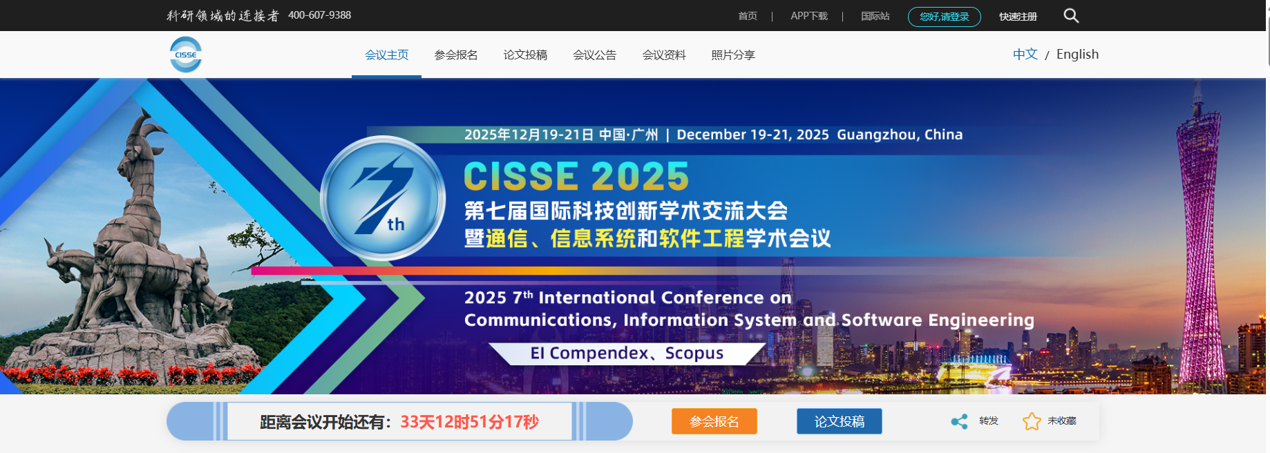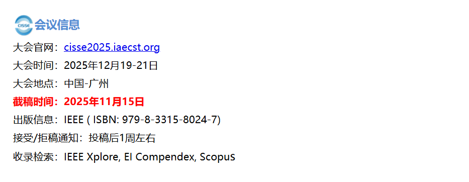 - 会议全称:第七届国际科技创新学术交流大会暨通信、信息系统和软件工程学术会议(7th International Conference on Innovation in Technology and Science & Conference on Information Systems, Software Engineering and Communication Engineering 2025,简称 CISSE 2025)